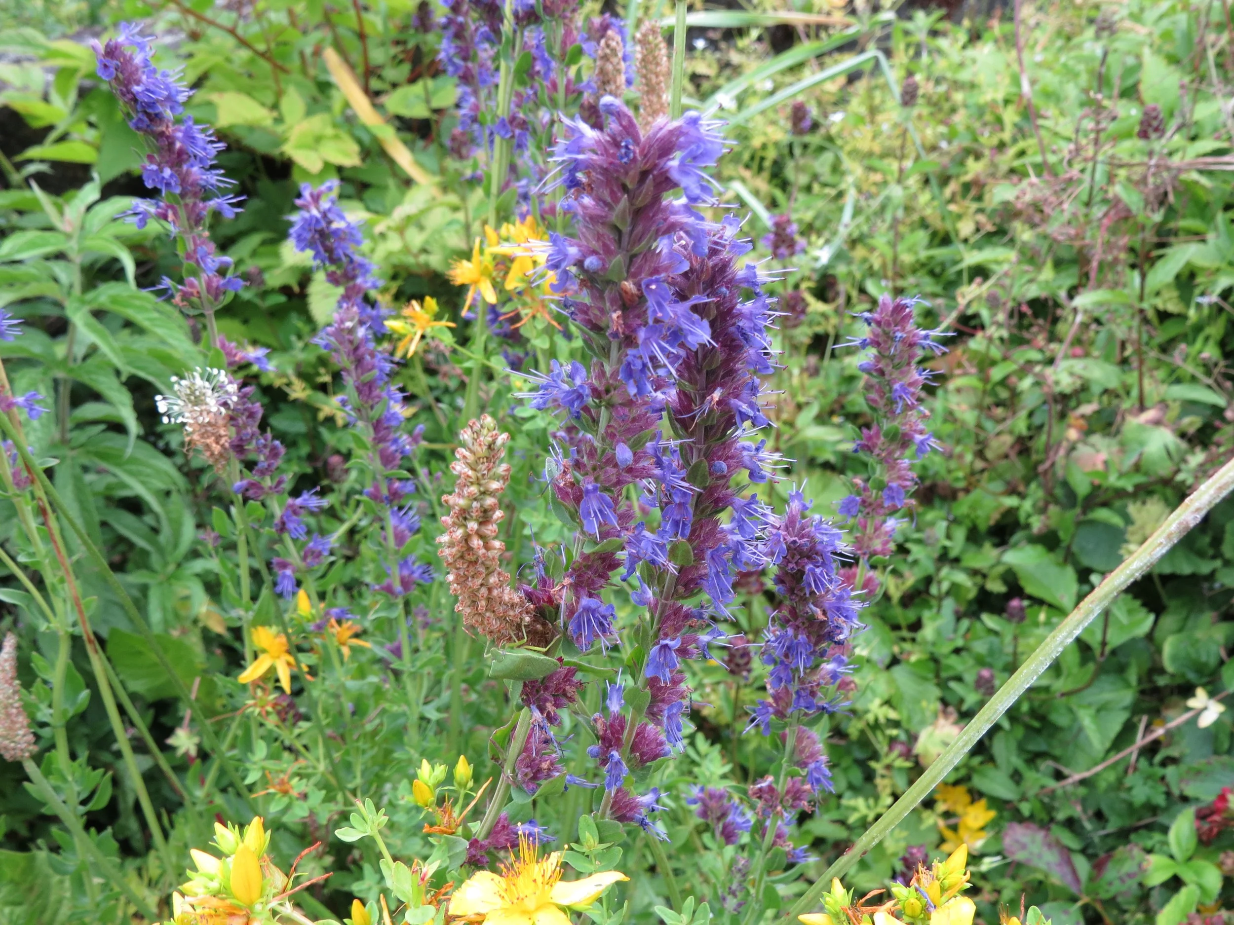 Hyssop, Hyssopus officinalis, has a stunning, intensely blue flower in early summer. In my pic it's mixed with St John's wort (the yellow) and ribort/plantain. The photo doesn't do her justice. She is a shining beauty in my garden with the bees and bumbles visiting her and my eyes drawn to her. when I rub my hands on the leaves she brings to mind the herbs thyme and oregano.